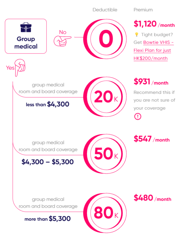 Insufficient protection from group medical could create HK$400k out-of-pocket costWays to improve coverage - Top Up with a high-end medical insurance (with deductibles)High-end medical on the market are not "perfect" top up plans for working-class Bowtie Pink (Ward) is another choice of "perfect" Top Up medical insuranceUnique advantages of the Bowtie Pink (Ward) plan: Cheapest Worldwide ProtectionFind the best plan for Top Up group medical insurance according to your group medical protection