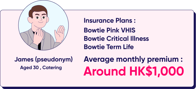 James (pseudonym) is 30 years old and works in the catering industry. He lives in a rental unit with two dogs. He purchased Bowtie Pink VHIS Plan, Bowtie Critical Illness, and Bowtie Term Life.