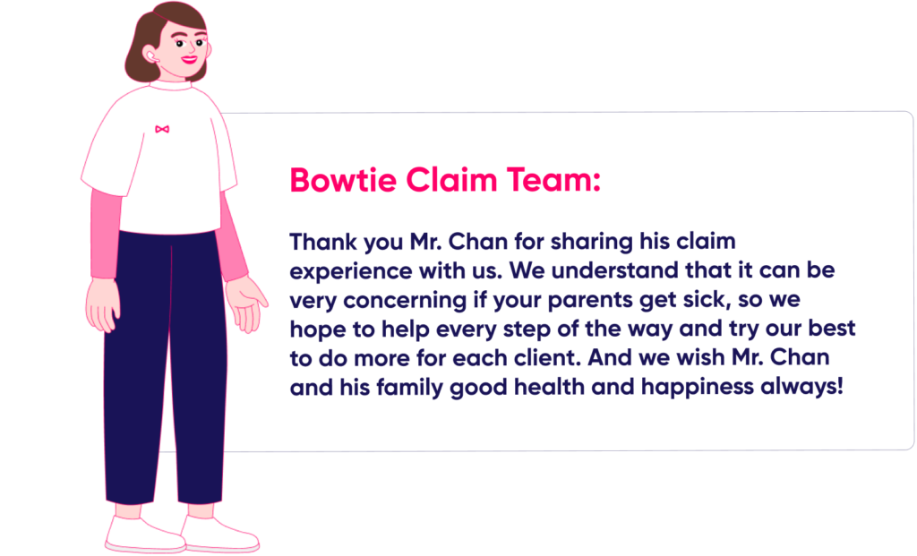 Mr. Chan had never claimed before and always thought it would be more practical to have an agent. However, since Bowtie’s online claim process is very convenient and easy to use, it turned out to be much simpler than he imagined. After his father’s surgery, Mr. Chan uploaded all the documents to Bowtie’s system. The claim was approved in a few days, and he promptly received the reimbursement.