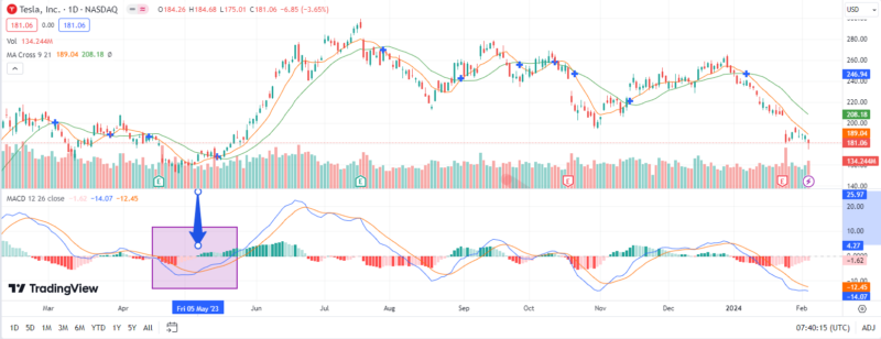 MACD黃金交叉的例子,萬賢以特斯拉為例,2023年5月5日,以DIFF 由下向上突破 DEA,為買入信號,可以看到MACD柱狀圖轉正初現,隨後開始一段尋頂的升浪,下圖截至2024年2月5日。