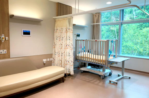 兒科私家病房地方寬敞,設有落地玻璃以飽覽優美景觀,除了病床外,更另有床位及梳化供親友陪宿。