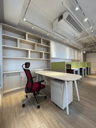 單位的室內設計選擇了一致的淺色系配色。辦公桌以綠色作為焦點,增加了舒緩的視覺元素,適當地緩解員工的視覺壓力。 而且,辦公室整體視覺美感散發出清爽的氛圍,讓來訪的客人也能感受到放鬆、舒適。