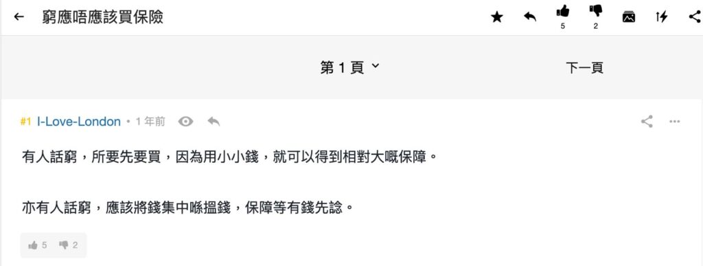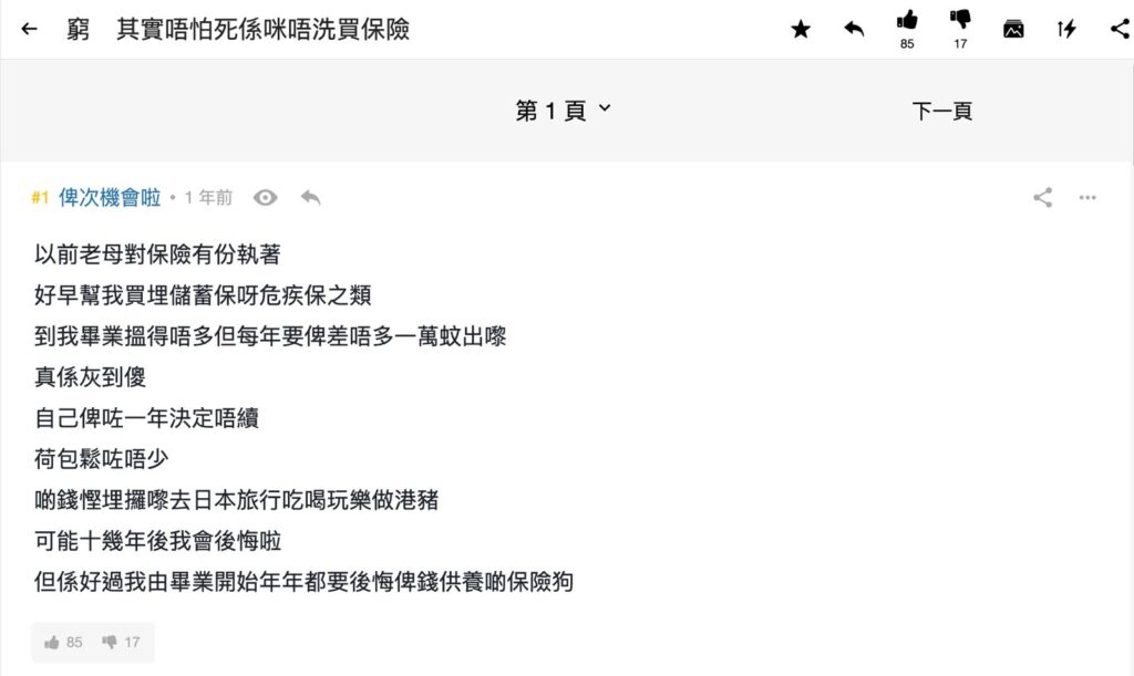 巴打「I-Love-London」指,有人說窮更應該買保險,因可用小小保費換來更大的保障;但他指亦有人說應先集中提升收入,保障日後再算;而另一巴打「俾次機會啦」則指,其母親一早便為他購入儲蓄單、危疾單,令他畢業後須每年供款近萬元,後來他決定不續供,多出來的錢可用作旅行使費,認為即使日後後悔,都比起供養保險從業員好。