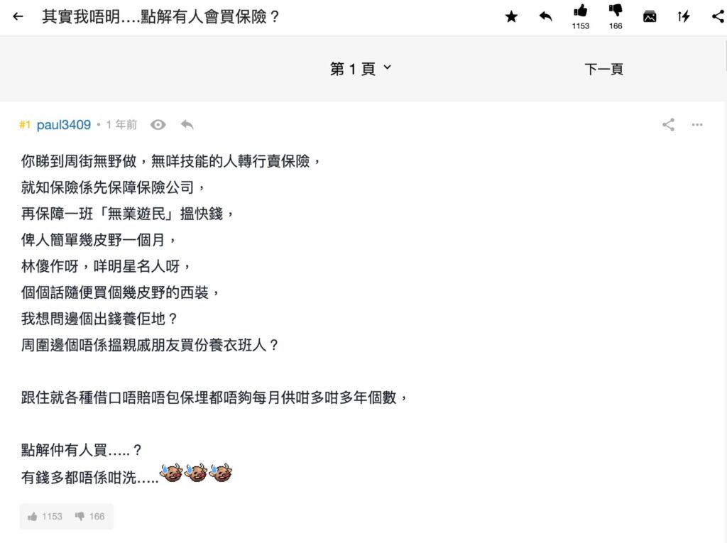 巴打「paul3409」發文指不明白為何有人會買保險,因他認為買保險其實是在供養保險中介,而且到最後都是「有買無賠」。其實巴打這樣說又未免過於武斷,透過保險中介投保又不一定是白白供養他們,一個好的保險經紀 (Broker) 或代理 (Agent) 可以為客戶提供專業的保障及理財建議,並為受保客戶管理保單及協助他們進行索償。我們明白每個行業也有害群之馬,保單變為孤兒單而不被通信、簽單後中介「潛水」不提供支援等事情亦不是新聞。