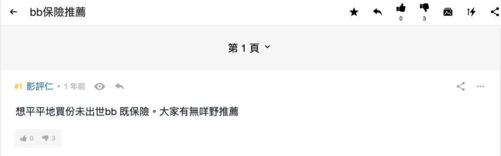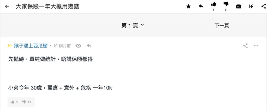 巴打「猴子遇上西瓜樹」發文問其他巴絲一年買保險用幾錢,並指自己一年保費約$1萬。事實上,不同人有不同的保障需要,所選的保單種類(醫療、危疾、人壽等;還分儲蓄型或非儲蓄型)、保額、供款期(適用於儲蓄型保單)也不盡相同,比較各自保額意義不大。