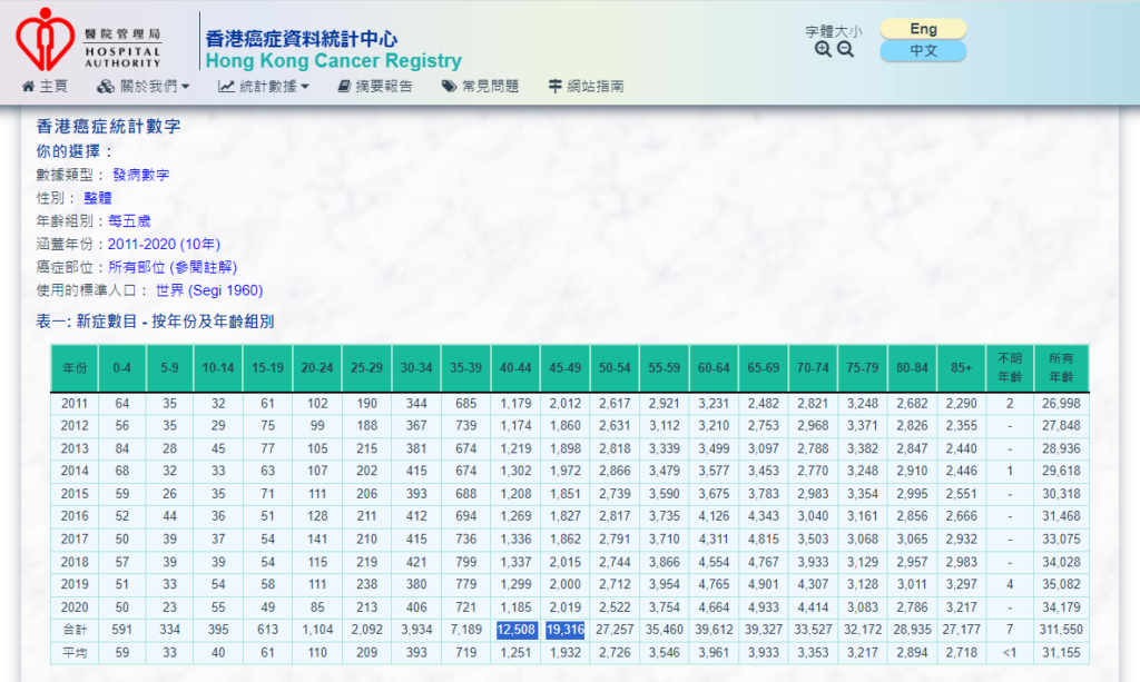 根據醫院管理局的統計數據,由2011年至2020年這10年間,在40至49歲的群組當中,已經有超過3.1萬人有癌症發病的經歷,比30至39歲上升近2倍,比20至29歲更激增近10倍,患癌風險絕對不容忽視!