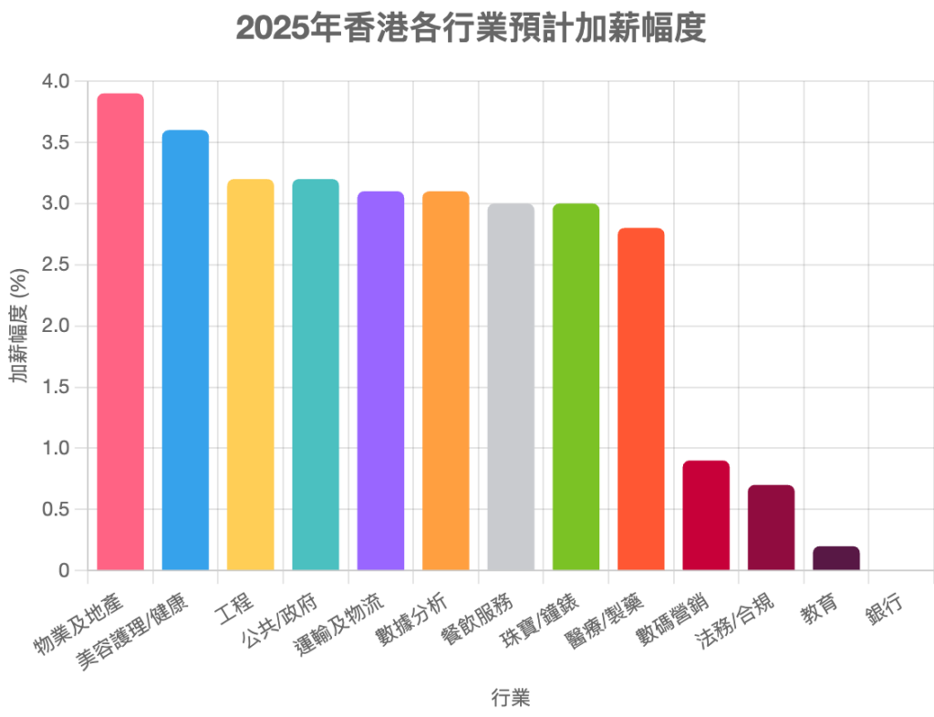 2025年香港打工仔的平均加薪幅度約為1.8%至3.6%,具體數字因行業而異。根據Jobsdb by SEEK《2025招聘、薪酬及福利調查報告》預測,整體平均加薪約為1.8%,較2024年下跌0.4個百分點。而香港整體薪酬預算調查則預計約4%,視乎行業及企業盈利情況而定。