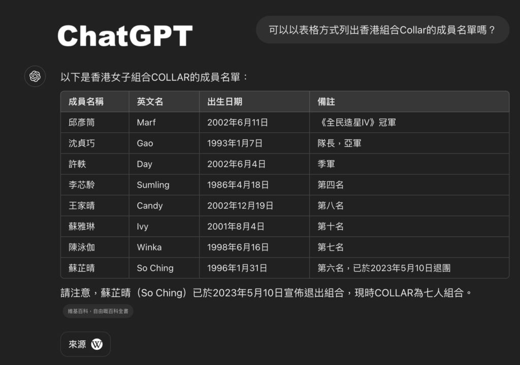 - 未能完全準確提供資料:經實測,DeepSeek 或未能準確回答用家問題。以查問「香港組合Collar的成員名單」為例,DeepSeek 就未能提供正確的最新成員名單及她們的出生日期。(見下圖)