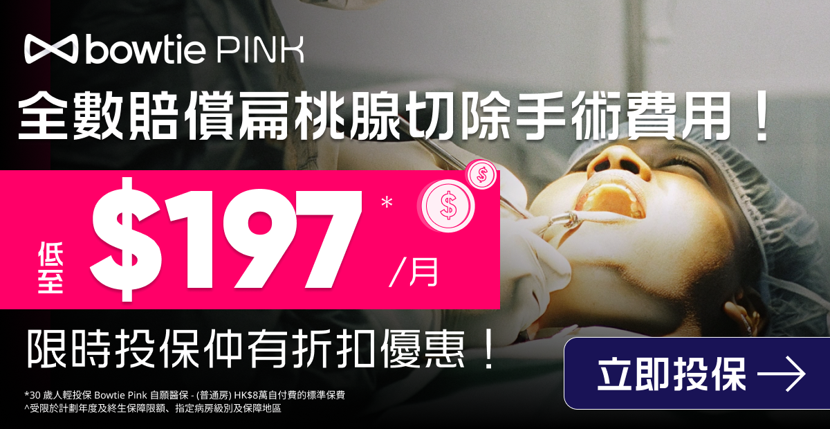 所有 Bowtie 自願醫保計劃也會保障「扁桃腺切除手術」,不過每個計劃的保障額也不一樣。以下會列出 Bowtie Pink 的保障額讓你參考: