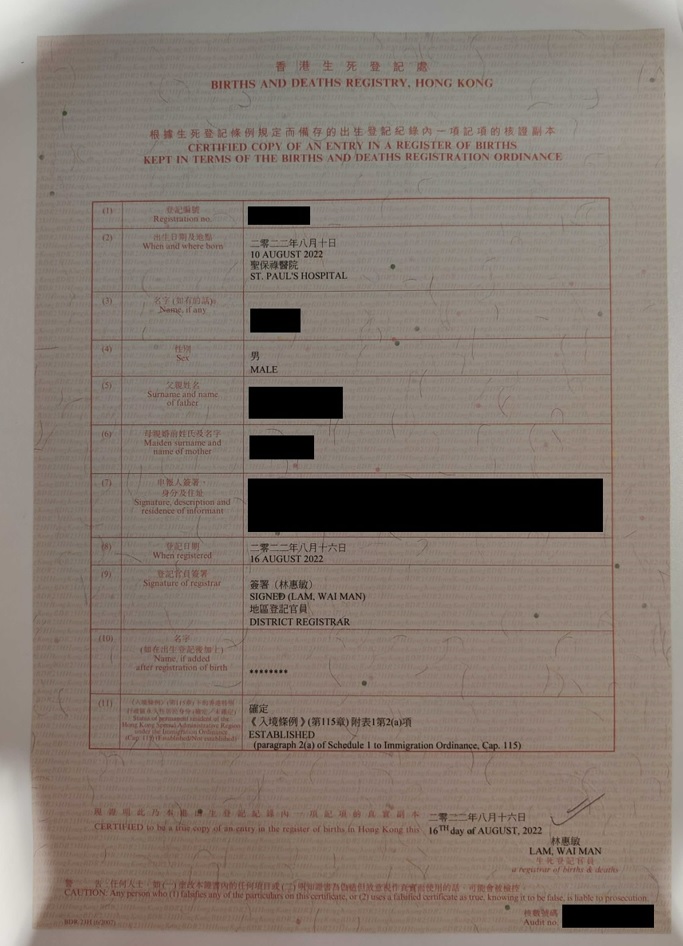基本上,如嬰兒為結婚而生下的子女,只需準備嬰兒父及母的身份證結婚證書正本,整個手續需時約30分鐘,完成後工作人員會問辦理人是否需要實體「副本」(俗稱︰「出世紙」),如有此需要便要等多約10分鐘。
