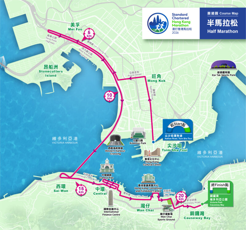 | 半馬拉松 | 尖沙咀彌敦道 | 維多利亞公園 | 尖沙咀彌敦道 (近美麗華酒店) → 甘肅街以南的彌敦道 → 甘肅街以北的彌敦道 (北行) → 亞皆老街 → 櫻桃街 (西行) → 連翔道 (南行) → 3 號幹線-出口3 → 青葵公路 (南行) → 折回 點 (近3 號幹線-出口4A) → 青葵公路 (南行) → 西九龍公路 (南行) → 西區海底隧道 (南行 管道) → 干諾道天橋 (東行) → 民寶街 → 民耀街 (南行) → 龍和道 (東行) → 博覽道 (北行) → 博覽道 (東行) → 博覽道東 (南行) → 會議道 (東行) → 鴻興道 → 馬師道天橋 → 駱克道 (東行) → 波斯富街 → 軒尼詩道 (東行) → 怡和街 (東行) → 糖街 → 銅鑼灣維多利亞公園。 |
