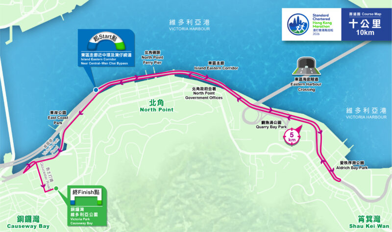 | 10公里賽事 | 東區走廊 | 維多利亞公園 | 北角 → 西灣河 → 炮台山 → 銅鑼灣維多利亞公園 |