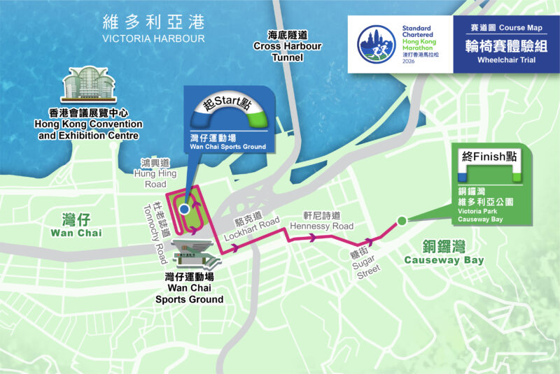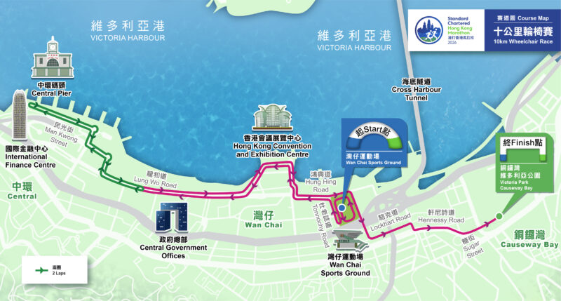 | 10公里輪椅賽 | 灣仔運動場 | 維多利亞公園 | 灣仔運動場 → 政府總部 → 中環碼頭 → 灣仔會展 → 銅鑼灣維多利亞公園 |