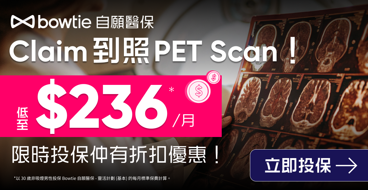 「正電子掃描」(Positron Emission Tomography,簡稱PET Scan)主要用於診斷癌症,若受保人在進行檢查後確診患上受保癌症, Bowtie 戰癌保將為受保人提供實報實銷的賠償(不設共同保險)。