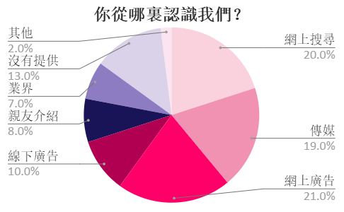 大部份客戶都從媒體報道(19%)和 Google 搜尋器(20%)認識我們。還記得 Bowtie 推出第一個產品時,適逢政府剛推出自願醫保計劃(VHIS),這令我們贏得不少本地及國際媒體的報道。