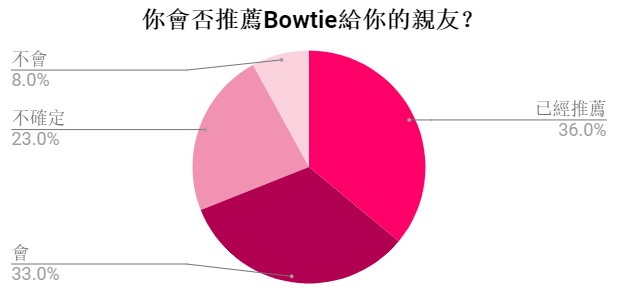 36% 的受訪客戶曾經向家人、朋友或同事推薦 Bowtie;另外 33% 亦樂意於朋友查詢時作出推薦。