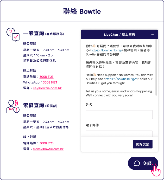 Bowtie 致力為你做得更好、更多,無論是入院前的賠償估算、出院免找數,或出院後的索償程序,我們都很樂意解答你大大小小的疑問,讓你得到適時的協助,安心治療。只要你 Call,我們一定答到盡,幫你 Claim 到順!