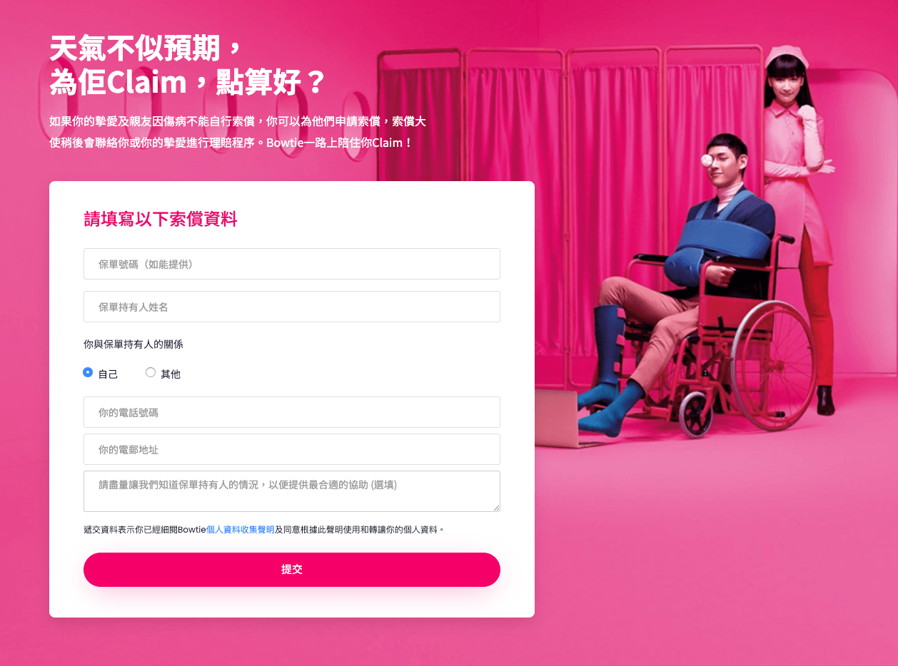 網上平台簡單易用,自己Claim當然方便,但有些個案中,客人可能比較不幸,當病情變得嚴重,自己未必可以完成索償程序。因此,Bowtie特設「免登入索償」服務專頁,令客人的親友也可以幫忙遞交索償。