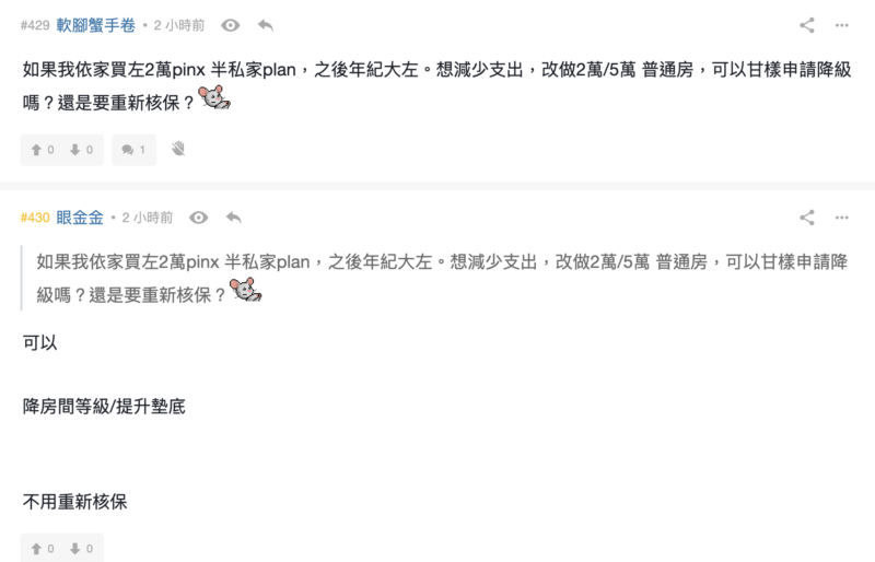 有買了Bowtie Pink 的連登巴打想知道,如果年紀大了想減低保費開支,是否可以申請改變自付費選項及保障的病房房型,當中會否涉及重新核保。另一巴打回應指「降房間等級/提升墊底,不用重新核保」,其實大致答對了是否需要重新核保的原則。