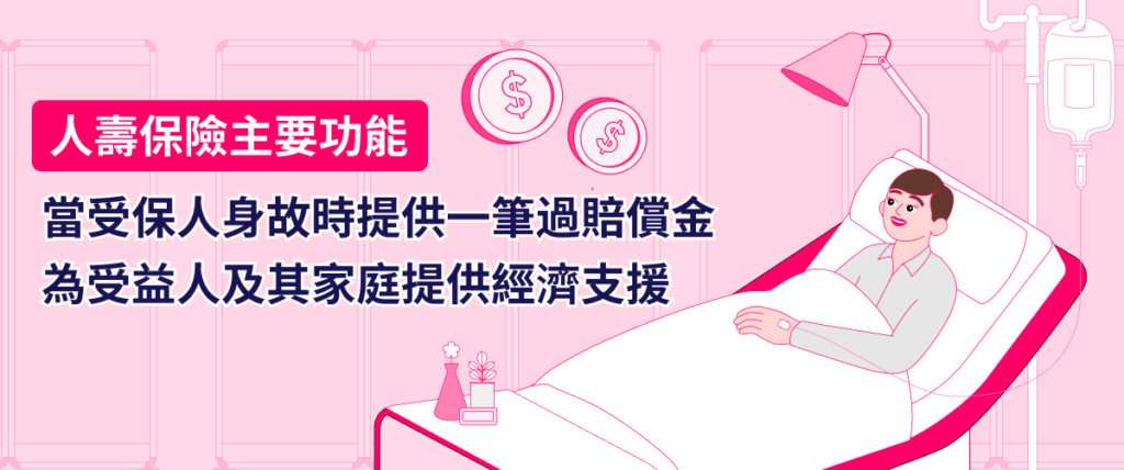 人壽保險的主要功能是當受保人身故時,保單能夠為指定的受益人(可多於一名)提供一筆過的身故賠償金,對受益人及其家庭提供經濟支援。人壽賠償金不限用途,可用以償還物業按揭貸款等債務、支付長期的租金、支持小朋友的教育開支等。