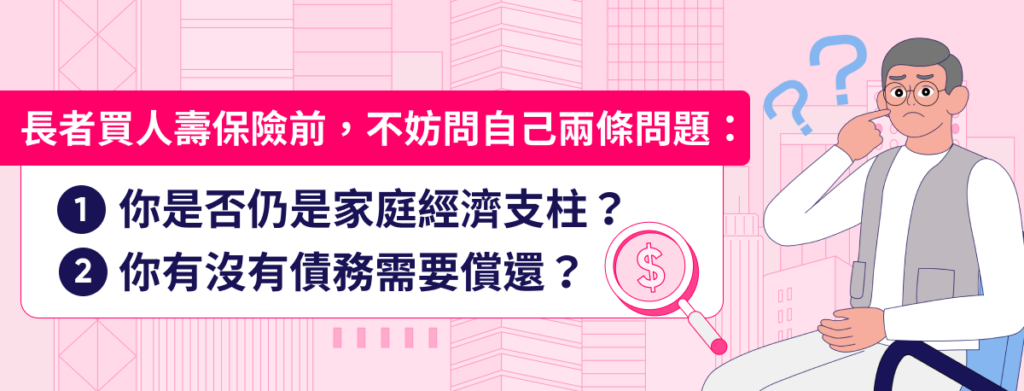 如果家庭仍需要你的收入才可支付日常生活開支,你便需要人壽保險,這視乎長者是否仍在工作,或是否有親人需要供養。
