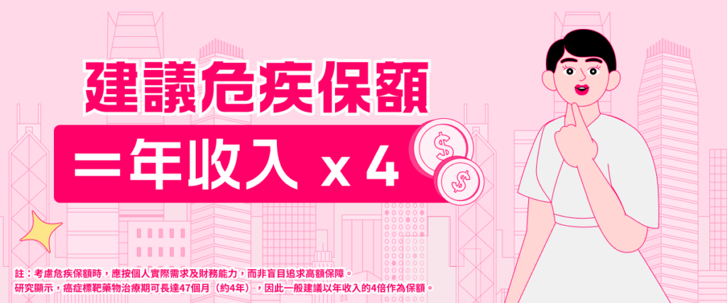 考慮危疾保額時,應按個人實際需求及財務能力,而非盲目追求高額保障。研究顯示,癌症標靶藥物治療期可長達47個月(約4年),因此一般建議以年收入的4倍作為保額。舉例來說,假設你的年收入為$36萬(月入$3萬),所需保額等於$36萬 x 4 = $144萬。